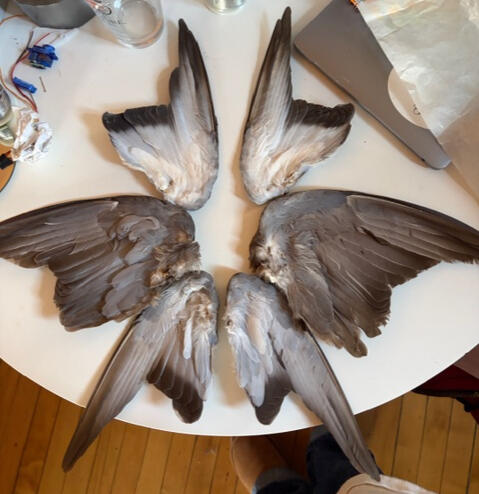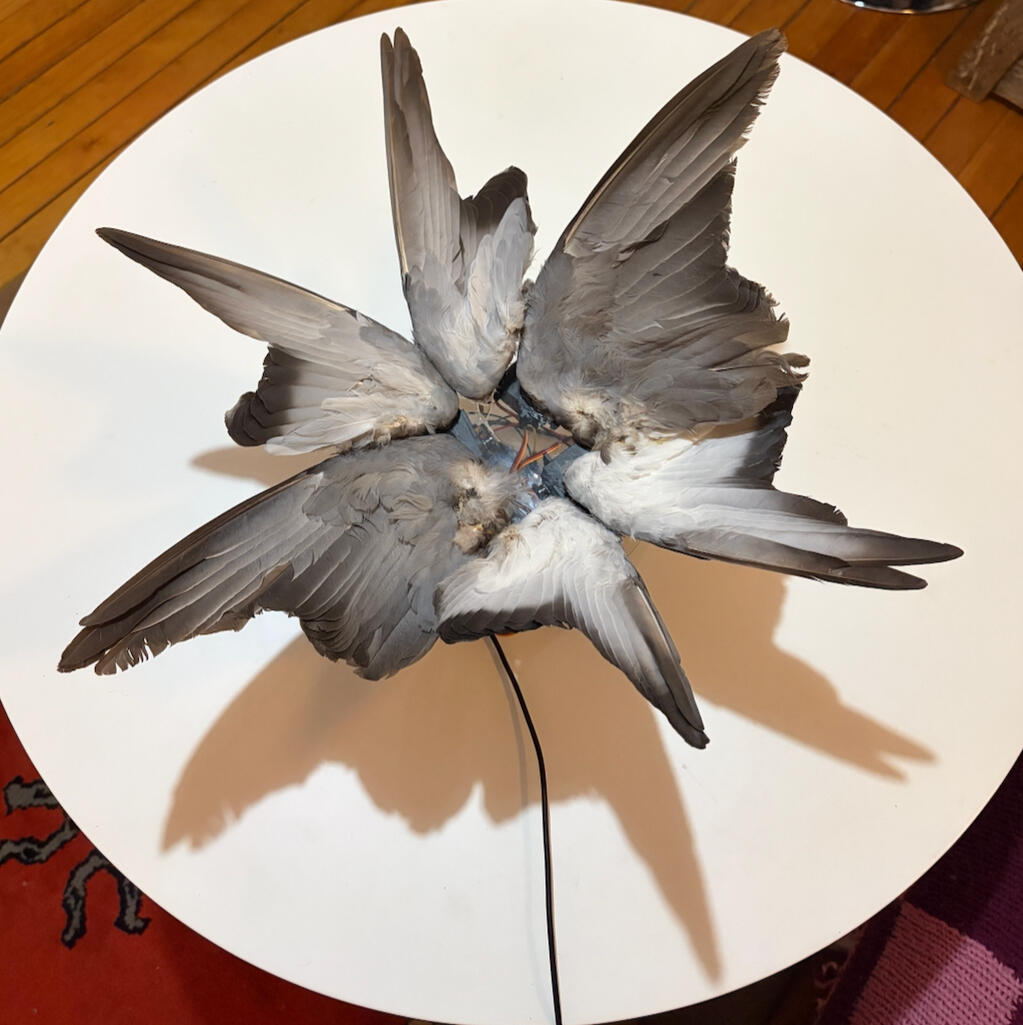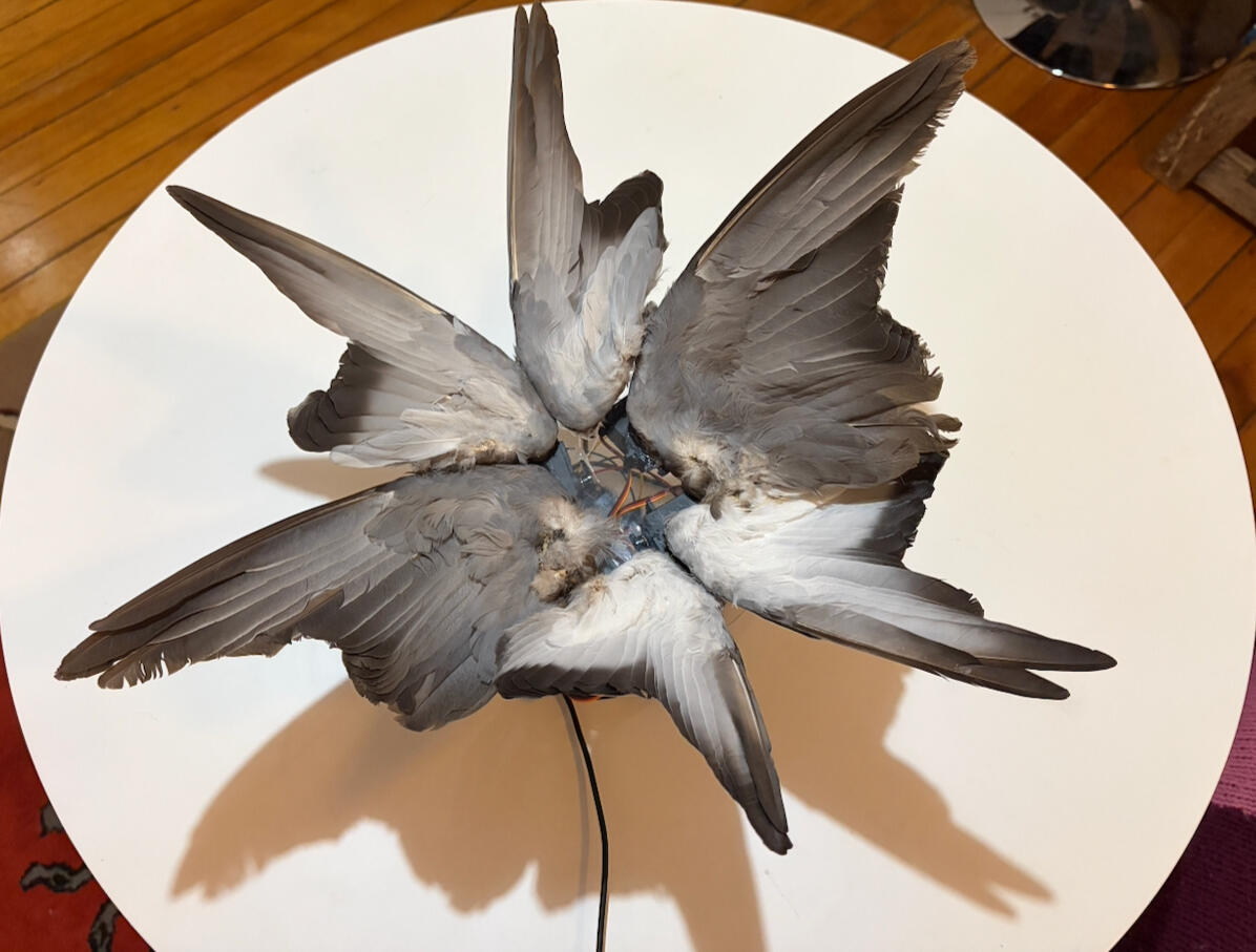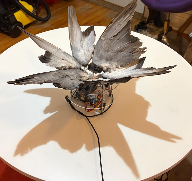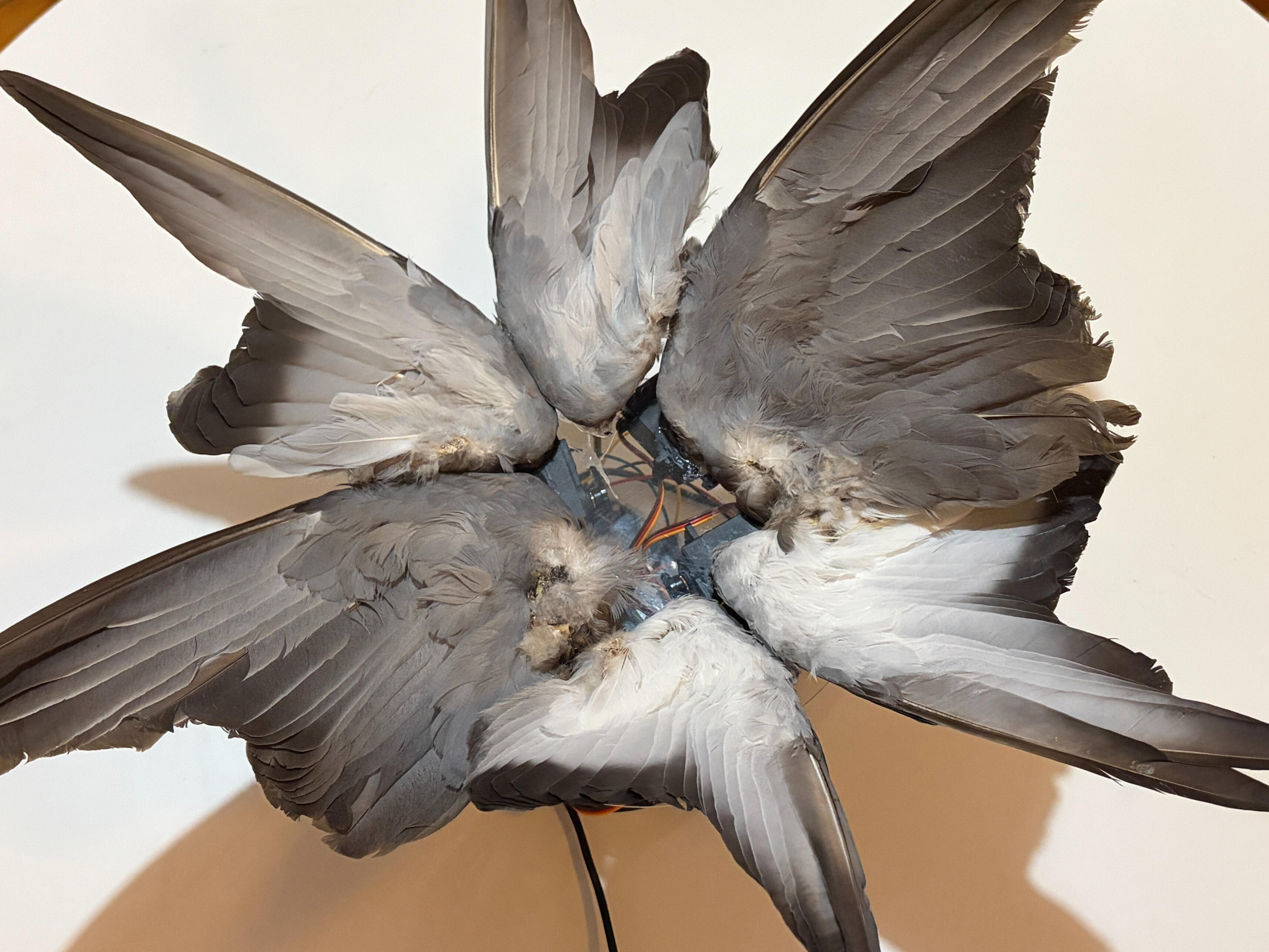 Urban SeraphimArduino, servo motors, taxidermy pigeon wings.10" x 24" x 22"2026.*Video will be uploaded shortly.